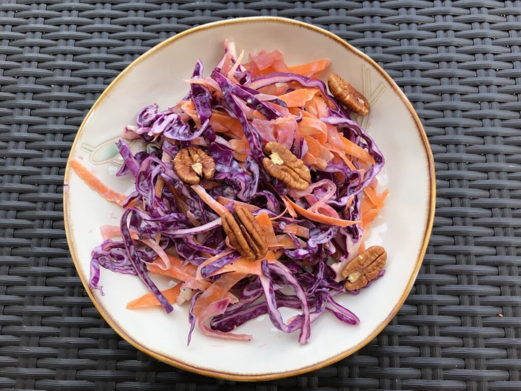 Ezt az egyszerű és gyors salátát fehér vagy lila káposztából készítem – attól függően, hogy éppen melyik van otthon –, de nem túl krémesre. Néha megszórom pekándióval vagy dióval, hogy ropogósabb legyen. Önmagában vagy köretként is frissítő és finom.