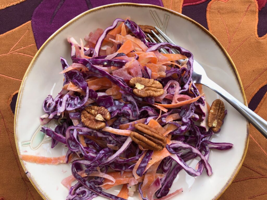I make this easy and quick slaw either with white or red cabbage, whichever is at home.